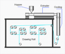 單絲 通過擠出機將高分子樹脂擠出細絲(如同從面條機中擠出面條一樣)形狀后進行冷卻,再拉伸成細絲以增強細絲強度的成型方法。 單...