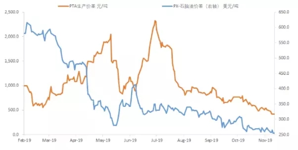 ????????整個產業上游都在擴張,而終端的需求一直不景氣,這種情形下,依靠變化莫測的原油市場和個別裝置檢修一兩周對市場預期也不會有太大的影響。而目前進入2019年年尾,今年PTA價格不斷創出新低。PTA價格重心下移的原因十分明顯,主要是大量PTA新裝置、尤其是大煉化配套PX新裝置年內持續投產。