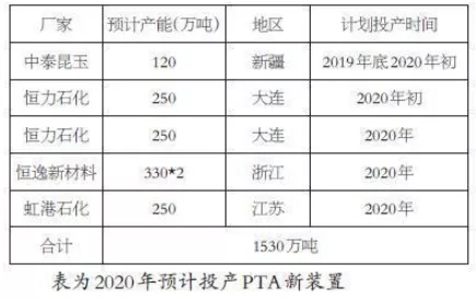 ????????恒力石化一套250萬噸PTA裝置計劃2019年年底投放到市場,另外一套250萬噸PTA裝置計劃2020年投放到市場。