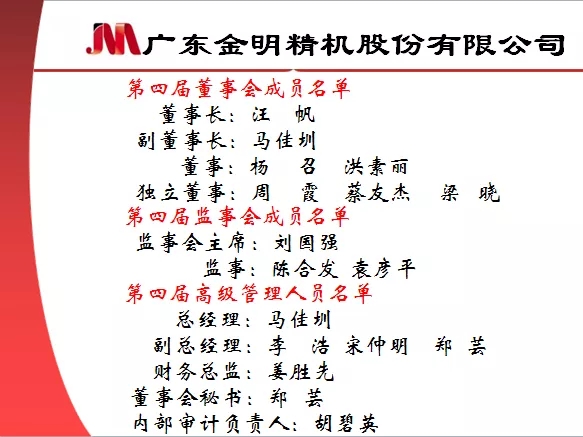 ????????本次換屆選舉中,汪帆先生、馬佳圳先生、楊召先生、洪素麗女士當(dāng)選為公司非獨(dú)立董事,周霞女士、梁曉先生、蔡友杰先生當(dāng)選為公司獨(dú)立董事,共同組成公司新一屆董事會(huì);劉國(guó)強(qiáng)先生、陳合發(fā)先生當(dāng)選為公司股東代表監(jiān)事,與金明精機(jī)職工代表監(jiān)事袁彥平先生共同組成公司新一屆監(jiān)事會(huì)。