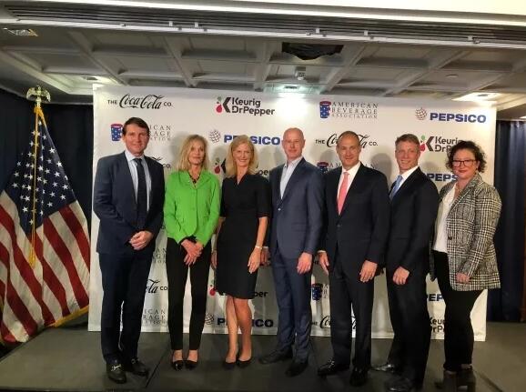 左起:百事可樂飲料北美公司首席執(zhí)行官Kirk Tanner、世界自然基金會(huì)私營部門業(yè)務(wù)高級副總裁Sheila Bonini、ABA總裁兼首席執(zhí)行官Katherine Lugar、 Keurig Dr Pepper首席商務(wù)官Derek Hopkins、可口可樂北美區(qū)總裁Jim Dinkins、Closed Loop Partners首席執(zhí)行官Ron Gonen;以及The Recycling Partnership首席執(zhí)行官Keefe Harrison。