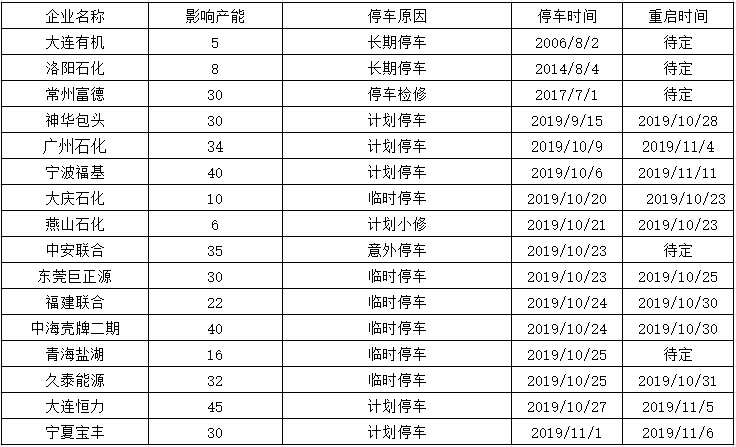 ????????10月份國內(nèi)聚丙烯檢修裝置較上月明顯減少。本月檢修損失量21萬噸。月內(nèi)裝置臨時(shí)停車較多,久泰能源、燕山石化、大慶石化、中安聯(lián)合、東莞巨正源、福建聯(lián)合二線、中海殼、久泰能源等裝置短期停車,多數(shù)已經(jīng)重啟。前期計(jì)劃檢修裝置延安煉廠、陜西延安能源、神華包頭、寧波臺塑等裝置月內(nèi)已重啟。目前廣州石化一、三線、東華能源(寧波)裝置處于停車狀態(tài),預(yù)計(jì)11月初重啟。后期寧夏寶豐存檢修計(jì)劃,整體供應(yīng)壓力較大。