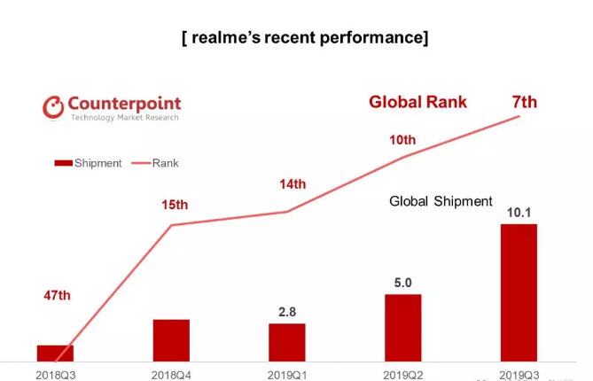 ????????據(jù)Counterpoint最新調(diào)研報(bào)告:realme手機(jī)第三季度出貨量超1000萬(wàn)臺(tái),同比增長(zhǎng)808%,位列全球前7,成為全球成長(zhǎng)最快的智能手機(jī)品牌。