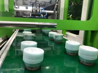????????伊之密PacPro薄壁包裝產(chǎn)品成型方案在現(xiàn)場也進(jìn)行了展示,2.2秒內(nèi)高速成型一出四貼標(biāo)圓形容器。