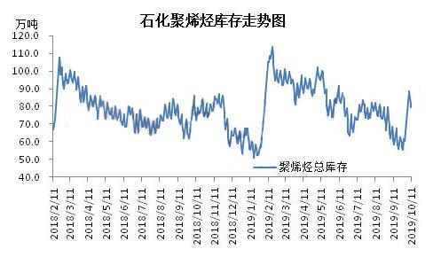 ????????為準備國慶長假,節前下游一度出現補倉,帶動9月底庫存降至最低時為55.5萬噸,雖最后庫存稍有增加,但整體情況尚可。隨著國慶長假到來,市場基本處于休市狀態,導致假期石化庫存大幅積累,增加28萬噸。即便節后下游補貨,但高庫存導致心態謹慎,多為剛需采購,庫存消耗緩慢并不理想。截止10月11日,石化兩桶油庫存為79.5萬噸。