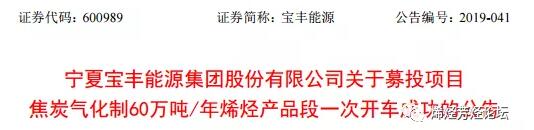 ????????公告顯示,焦炭氣化制60萬噸/年烯烴項目是寶豐能源首發(fā)上市募集資金投資項目,項目總投資金額達(dá)152.79億元。該項目主要分為兩段:前段焦炭氣化制220萬噸/年甲醇項目,后段甲醇制60萬噸/年聚烯烴項目,以及相關(guān)配套公用工程,預(yù)計將于2019年底前全部建成投產(chǎn)。