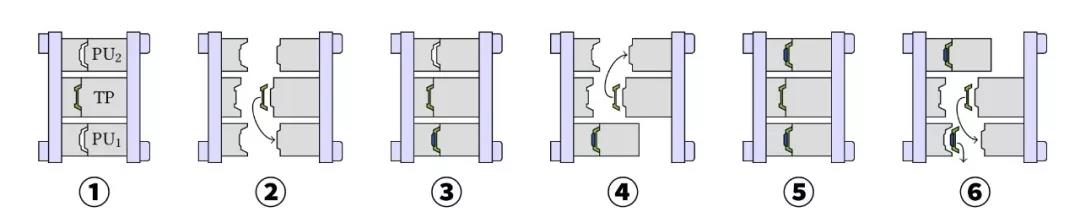 ????????圖1顯示了用于注塑成型與聚氨酯包覆成型的組合技術的傳統模具技術。首先,注入熱塑性塑料基體,旋轉裝置將基體帶入聚氨酯模具中。在下一個循環中,基體用聚氨酯包覆成型,同時在注塑模具中生產新的熱塑性基體。熱塑性基體的成型周期和聚氨酯涂層的反應時間是相關的。