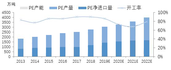 ????????PE國內產能不斷擴增的同時,國際PE產能同樣快速增長,尤其近年來北美及中東地區以輕烴為原料的PE裝置快速投產,我國是國際PE產品主要消費國,國際PE產品的主要消費目的地,導致我國PE進口量仍保持快速增長。近年PE進口依存度仍保持在50%左右。進口PE產品依托其成本價格優勢,在國內仍占有一席之地,預計PE進口依存度下降緩慢。2019年國內PE表觀需求量預計在3270萬噸左右,產量將達到1745萬噸,進口量在1550萬噸左右,國內PE進口依存度約在49%左右。隨著國內PE新增產能陸續釋放,預計2020-2022年國內PE裝置開工率或有所下降。