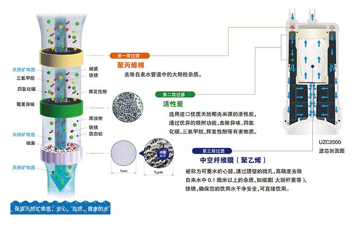 ????????通過聚丙烯棉、活性炭及中空纖維膜組成的三層過濾系統,過濾后保留天然礦物質,為用家帶來安心、自然、健康的飲用水。
