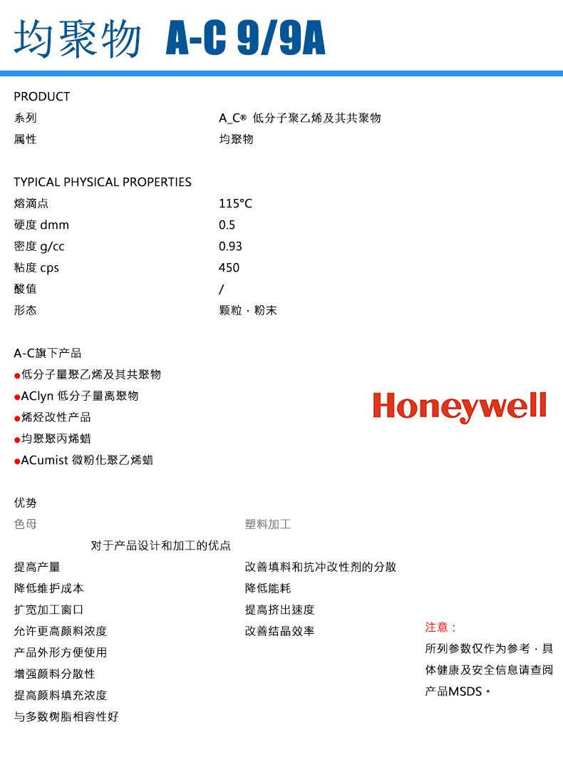 • 霍尼韋爾 A-C® 9A 低密度聚乙烯 (LDPE) 均聚物 物性表, 霍尼韋爾 A-C® 9A 低密度聚乙烯 (LDPE) 均聚物 產品參數,霍尼韋爾 A-C® 9A 低密度聚乙烯 (LDPE) 均聚物 性能表,霍尼韋爾 A-C® 9A 低密度聚乙烯 (LDPE) 均聚物 出廠報告, MSDS,, 物質安全資料表, UL黃卡,{ SGS報告, RoHS, 食品級認證, NSF飲用水標準, 產品資料, 產品性能, 出廠報告, 原廠原包, 代理商, 熱變形溫度, 熔指數, 流動系數, 抗沖擊性能、沖擊強度, 低溫韌性、低溫抗沖擊性能, 熔體流動系數、熔體流動速率, 加工工藝、加工參數、加工溫度, 歐盟RoHS 德國FDA 美國FDA 日本FDA