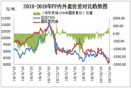由2019年P(guān)P內(nèi)外盤價(jià)差對比發(fā)現(xiàn),12月份市場內(nèi)外盤價(jià)格開始逐步扭轉(zhuǎn)局勢,主因目前國際聚丙烯裝置多套開車并不順利,如馬來西亞石油公司裂解裝置問題及俄羅斯西布爾裝置前期開車均出現(xiàn)短期不順利現(xiàn)象,同時(shí)西方國家面臨新年節(jié)日,多數(shù)生產(chǎn)企業(yè)開工負(fù)荷下降,導(dǎo)致國內(nèi)到港資源偏緊。而國內(nèi)市場因產(chǎn)能急劇上升及終端訂單跟進(jìn)乏力制約,國內(nèi)市場低價(jià)不斷頻現(xiàn),從而內(nèi)外盤價(jià)差逐步逆轉(zhuǎn)。