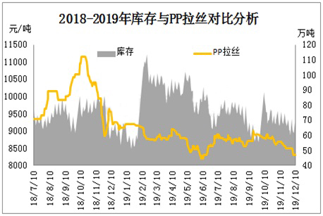 2019年12月庫存顯示整體呈現(xiàn)震蕩下滑趨勢,整體庫存維持在60-70萬噸/年,但全球經(jīng)濟(jì)偏弱運(yùn)行及國內(nèi)實(shí)體企業(yè)訂單力度不及預(yù)期,市場原料消耗力度受到制約。同時(shí)2019年P(guān)P新一輪擴(kuò)能高峰期再次來臨,浙江石化及大連恒力等大型聚烯烴裝置落地試運(yùn)行,市場供需壓力更加凸顯,加快現(xiàn)貨市場拉絲下挫壓力。