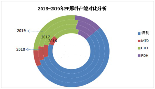 由2016-2019年P(guān)P原料產(chǎn)能對(duì)比分析發(fā)現(xiàn),煤制烯烴產(chǎn)能增速最快,由2016年336萬(wàn)噸增加到2019年633萬(wàn)噸,增加297萬(wàn)噸。其中2016年煤制烯烴產(chǎn)能占比18%,2019年煤制烯烴產(chǎn)能占比已經(jīng)高達(dá)26%,占比增加8%,其增速令人驚訝。另外PDH系列也是增速較快產(chǎn)品,由于丙烷脫氫產(chǎn)品因成本優(yōu)勢(shì)明顯,后期擴(kuò)能產(chǎn)品也將呈現(xiàn)新得突破。原料多元化,市場(chǎng)競(jìng)爭(zhēng)壓力也將逐步升級(jí)。