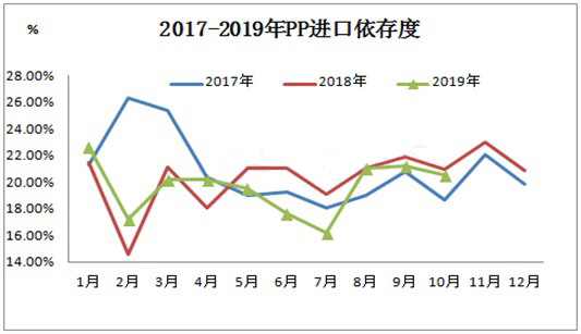 2019年P(guān)P進(jìn)口依賴度呈現(xiàn)偏弱震蕩局勢(shì),2019年1-10月進(jìn)口總量2099.19萬(wàn)噸,較2018年1-10月份(總量1958.87萬(wàn)噸)增加140.32萬(wàn)噸,增幅7.16%。因國(guó)內(nèi)受環(huán)保嚴(yán)查,對(duì)進(jìn)口廢舊塑料實(shí)行嚴(yán)格禁止后,國(guó)內(nèi)對(duì)PP原料需求相應(yīng)增加,部分進(jìn)口資源相應(yīng)增加,以填補(bǔ)國(guó)內(nèi)需求。但PP進(jìn)口整體依賴度呈現(xiàn)逐步下降趨勢(shì),目前2019年進(jìn)口依賴度平均值在19.63%,可見(jiàn)伴隨國(guó)內(nèi)產(chǎn)能不斷激增,部分國(guó)產(chǎn)料逐步替代進(jìn)口產(chǎn)品,進(jìn)口依賴度也相應(yīng)下降。