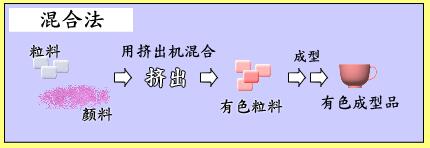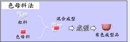 這種方法主要在注塑成型時,把顏色溶度高的有色母料混合到著色材料中,主要用于黑灰色產品著色。