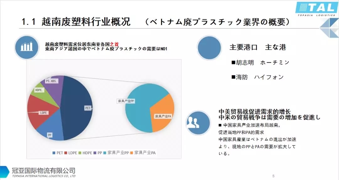 ????????越南廢塑料需求位居東南亞各國之首,再生塑料在越南的市場有PET,PP,PE,PS,ABS,PA。主要進口港口:海防,胡志明。