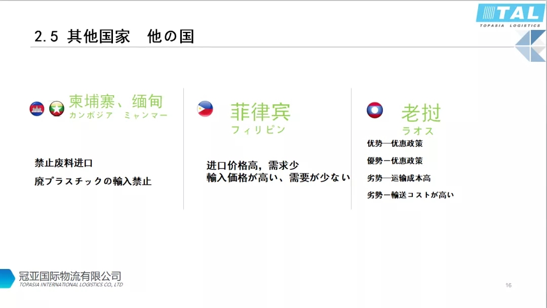 ????????菲律賓碼頭擁擠,國內安全環境堪憂,再生資源的利用規模非常小。進口成本比泰國還高約3500美金/柜,廢塑料企業很難生存。