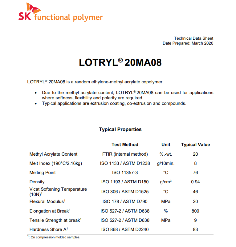 - 阿科瑪增韌劑相容劑EMA Lotryl 20MA08 物性表, 阿科瑪增韌劑相容劑EMA Lotryl 20MA08 產(chǎn)品參數(shù),阿科瑪增韌劑相容劑EMA Lotryl 20MA08 性能表,阿科瑪增韌劑相容劑EMA Lotryl 20MA08 出廠報(bào)告, MSDS,, 物質(zhì)安全資料表, UL黃卡,{ SGS報(bào)告, RoHS, 食品級(jí)認(rèn)證, NSF飲用水標(biāo)準(zhǔn), 產(chǎn)品資料, 產(chǎn)品性能, 出廠報(bào)告, 原廠原包, 代理商, 熱變形溫度, 熔指數(shù), 流動(dòng)系數(shù), 抗沖擊性能、沖擊強(qiáng)度, 低溫韌性、低溫抗沖擊性能, 熔體流動(dòng)系數(shù)、熔體流動(dòng)速率, 加工工藝、加工參數(shù)、加工溫度, 歐盟RoHS 德國(guó)FDA 美國(guó)FDA 日本FDA
