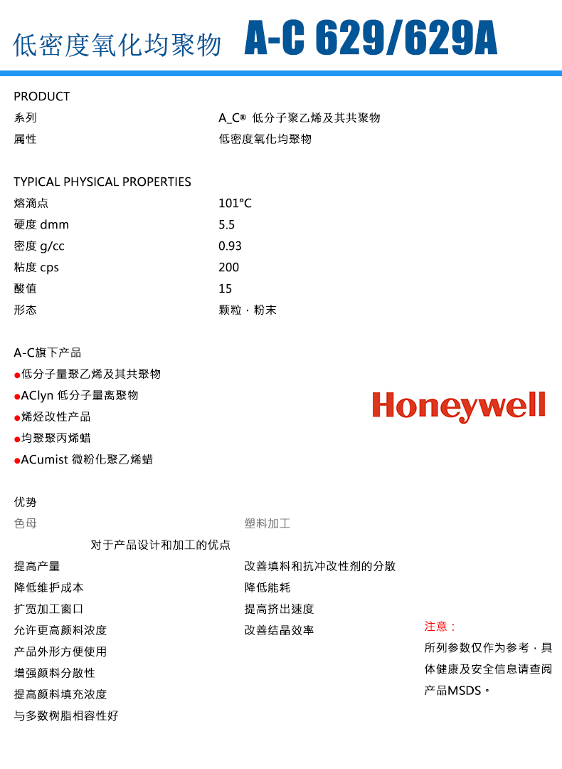 • 美國霍尼韋爾 honeywell 氧化聚乙烯蠟 AC 629 物性表, 美國霍尼韋爾 honeywell 氧化聚乙烯蠟 AC 629 產品參數,美國霍尼韋爾 honeywell 氧化聚乙烯蠟 AC 629 性能表,美國霍尼韋爾 honeywell 氧化聚乙烯蠟 AC 629 出廠報告, MSDS,, 物質安全資料表, UL黃卡,{ SGS報告, RoHS, 食品級認證, NSF飲用水標準, 產品資料, 產品性能, 出廠報告, 原廠原包, 代理商, 熱變形溫度, 熔指數, 流動系數, 抗沖擊性能、沖擊強度, 低溫韌性、低溫抗沖擊性能, 熔體流動系數、熔體流動速率, 加工工藝、加工參數、加工溫度, 歐盟RoHS 德國FDA 美國FDA 日本FDA
