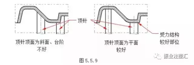 ????????(3)避免跨臺階或在斜面上設置頂針,頂針頂面應盡量平緩,頂針應布置于膠件受力較好的結構部位。如圖5.5.9所示。